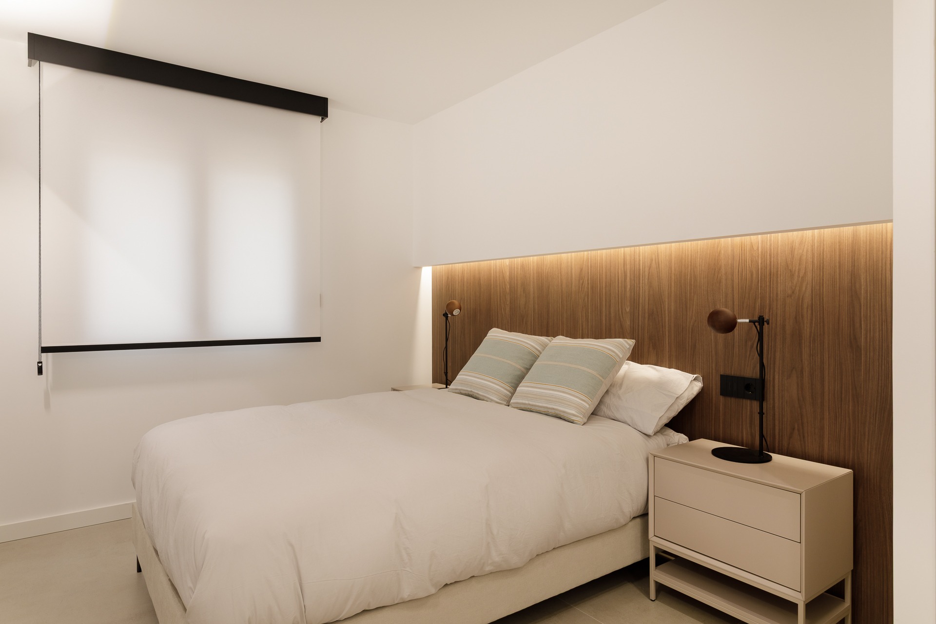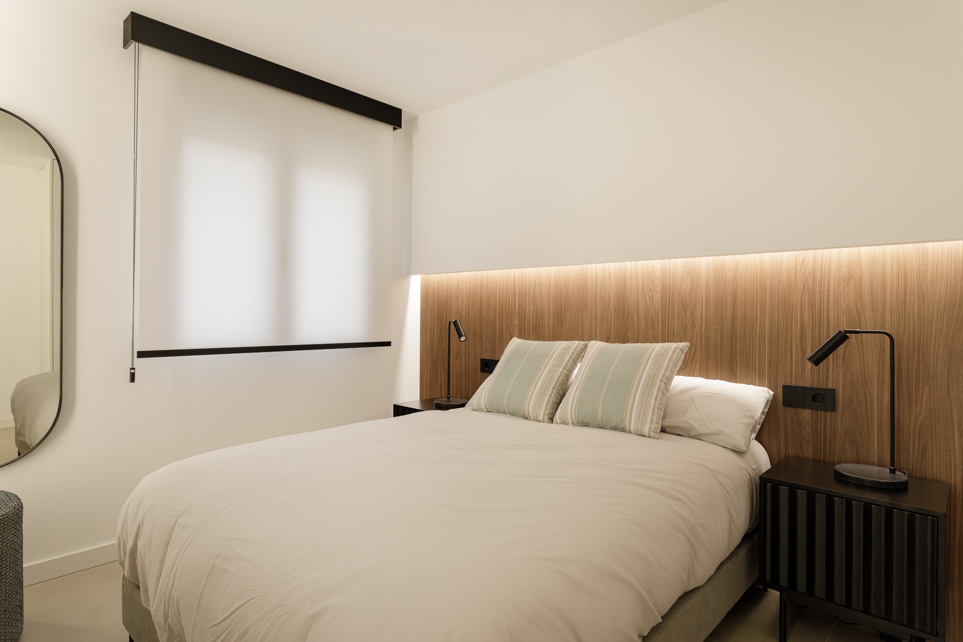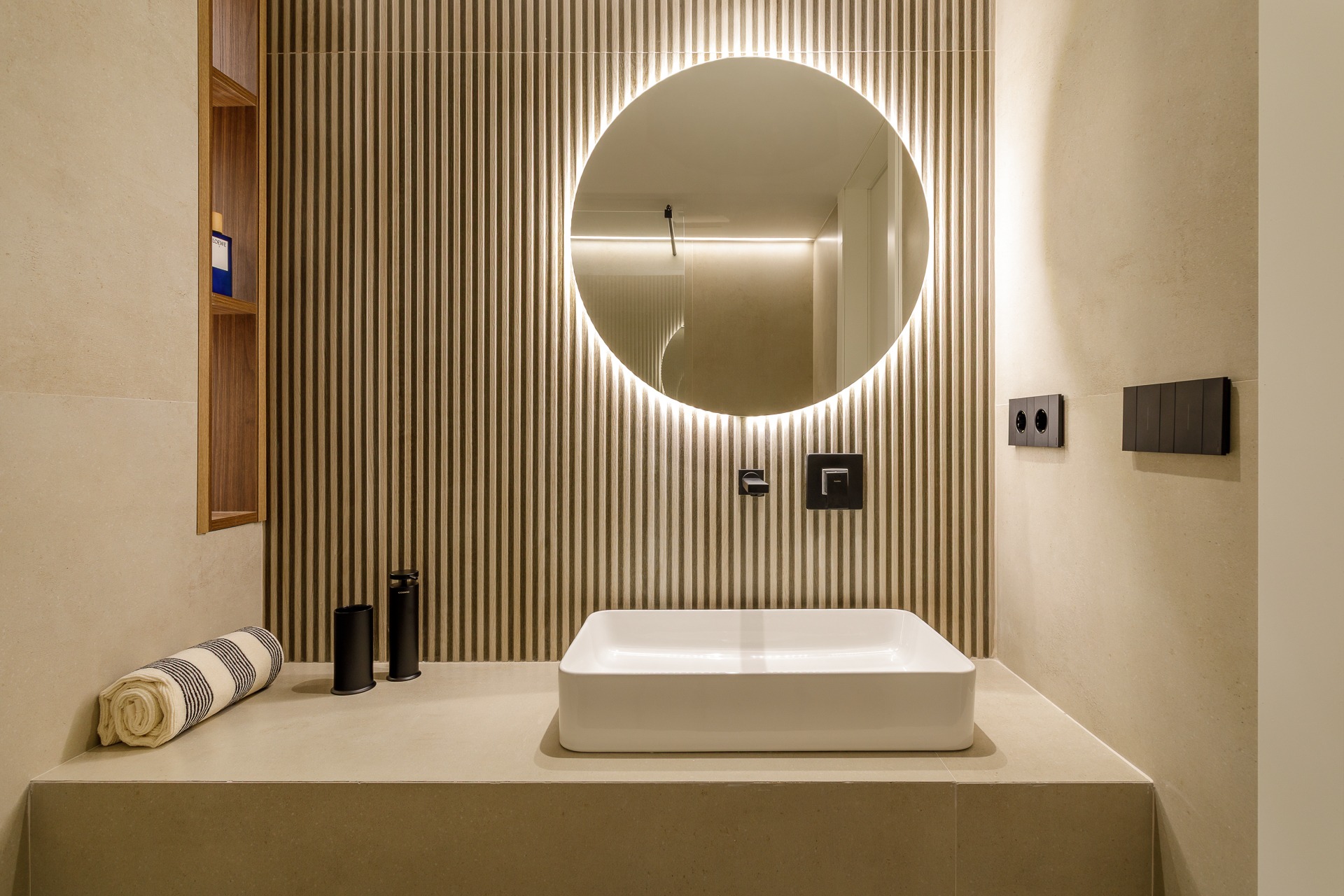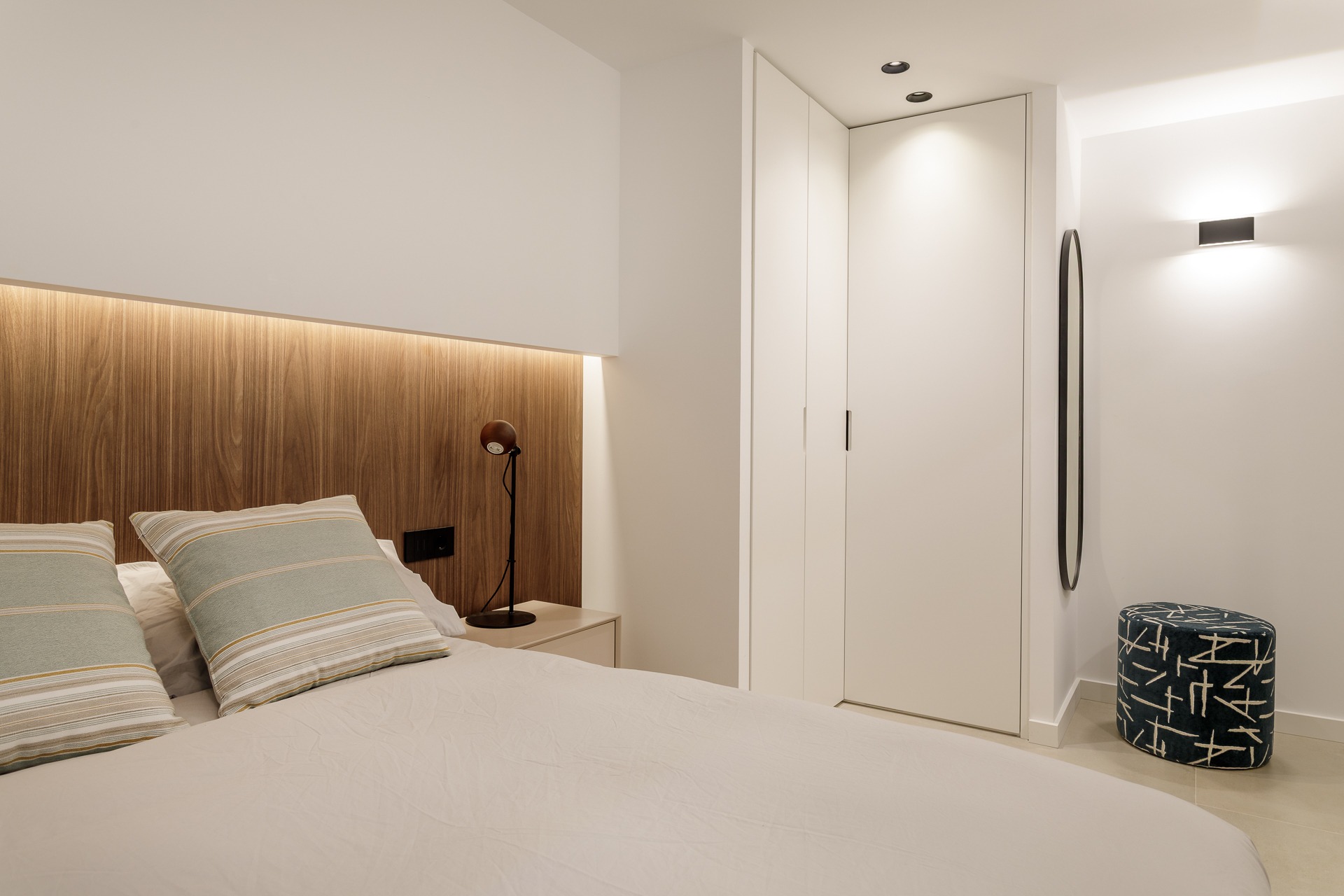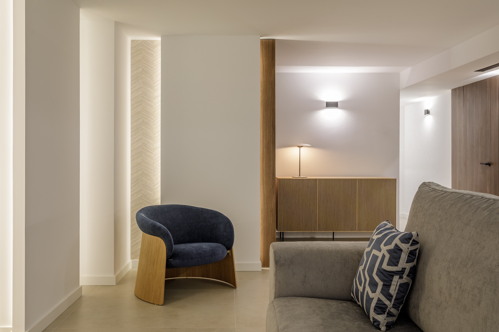 El plano vertical destaca el uso de panelados de madera, un revestimiento que aporta ritmo y una calidez orgánica que contrasta con la sobriedad del paramento blanco.