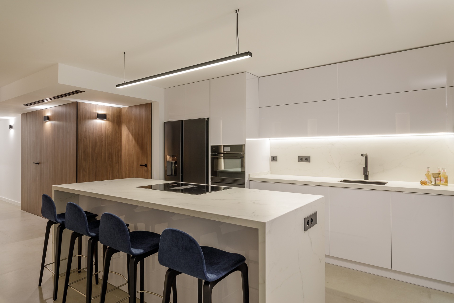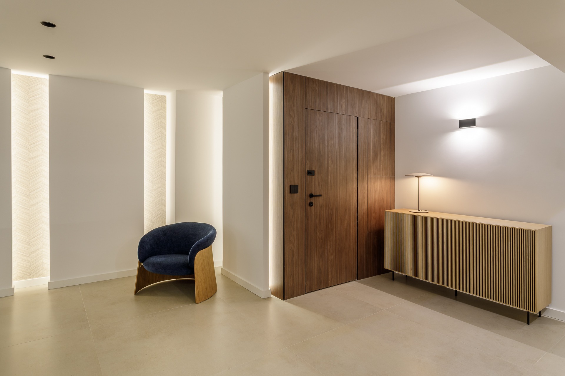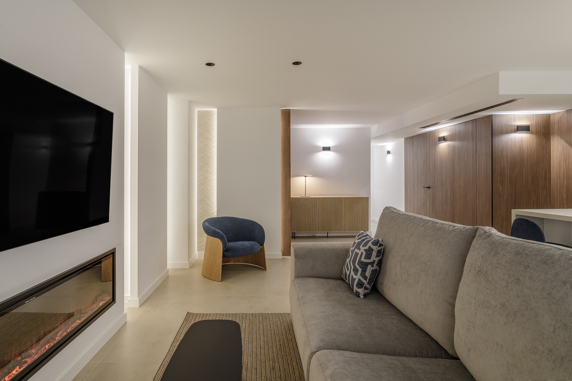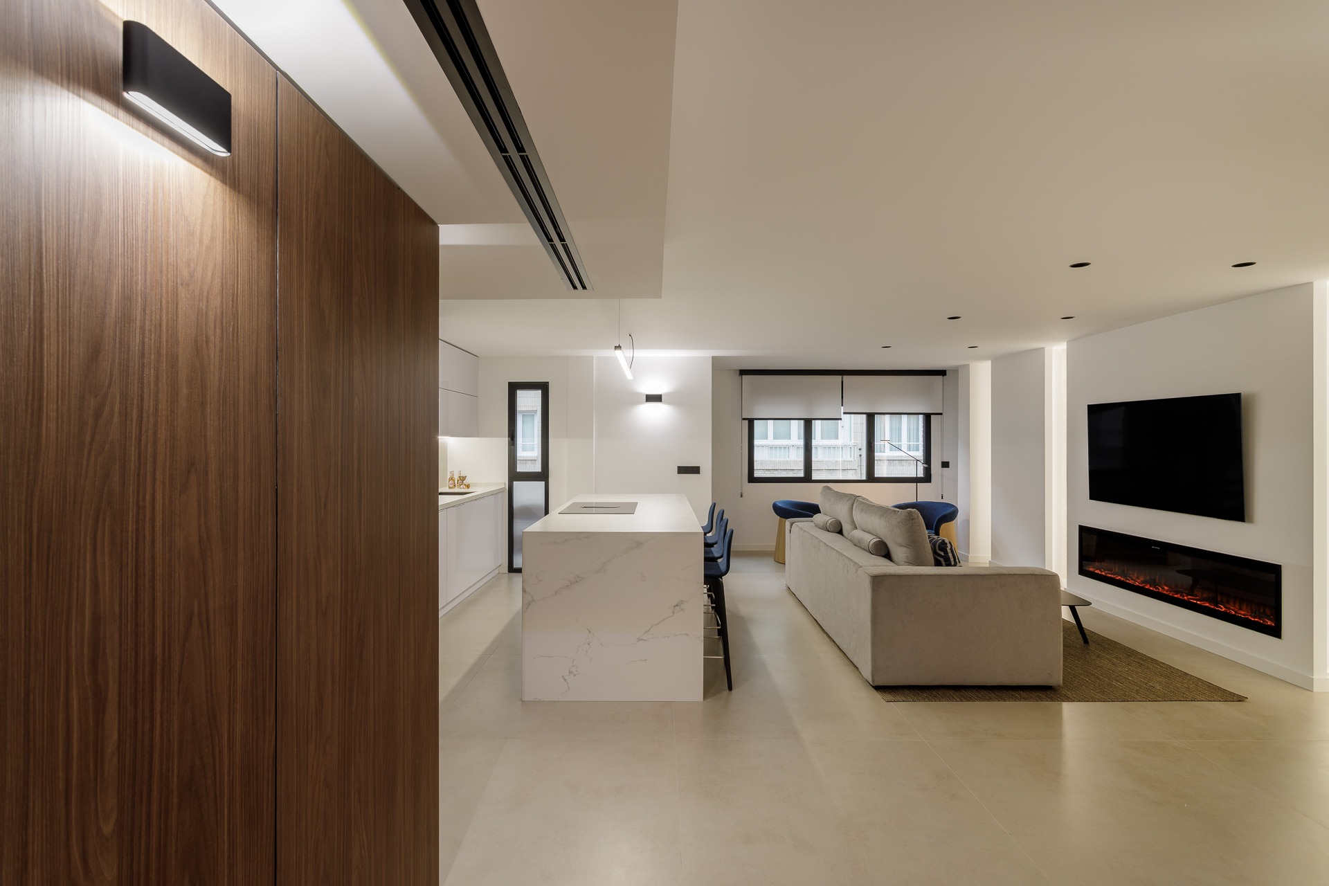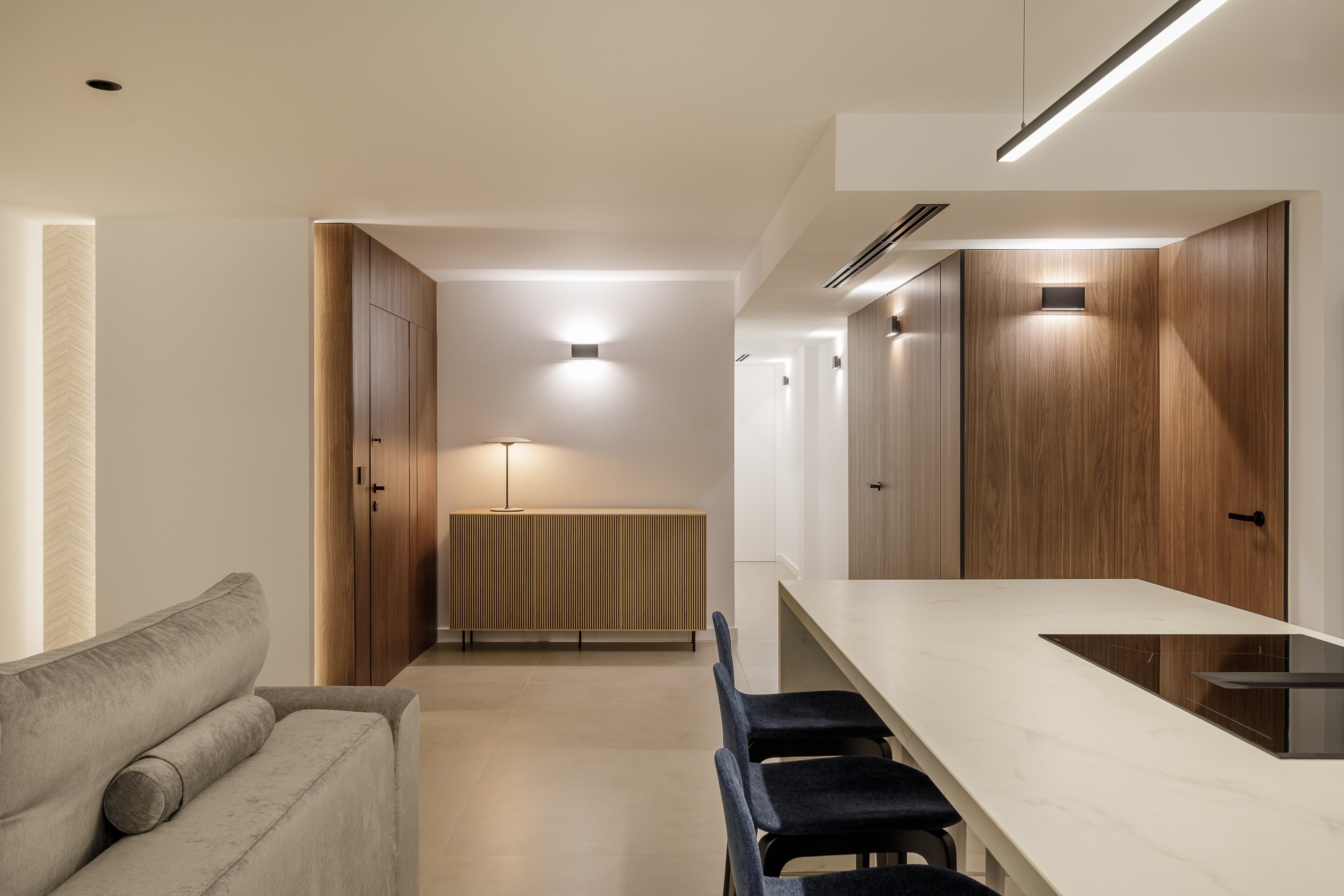 El verdadero protagonista es el estudio lumínico. Se ha proyectado una iluminación indirecta integrada mediante foseados verticales y horizontales en paramentos y techos técnicos que favorece la conexión de espacios.