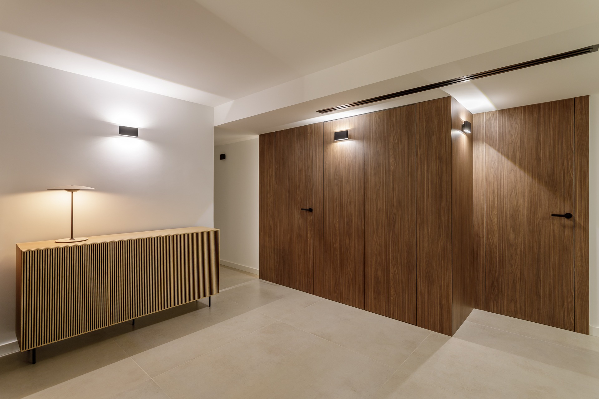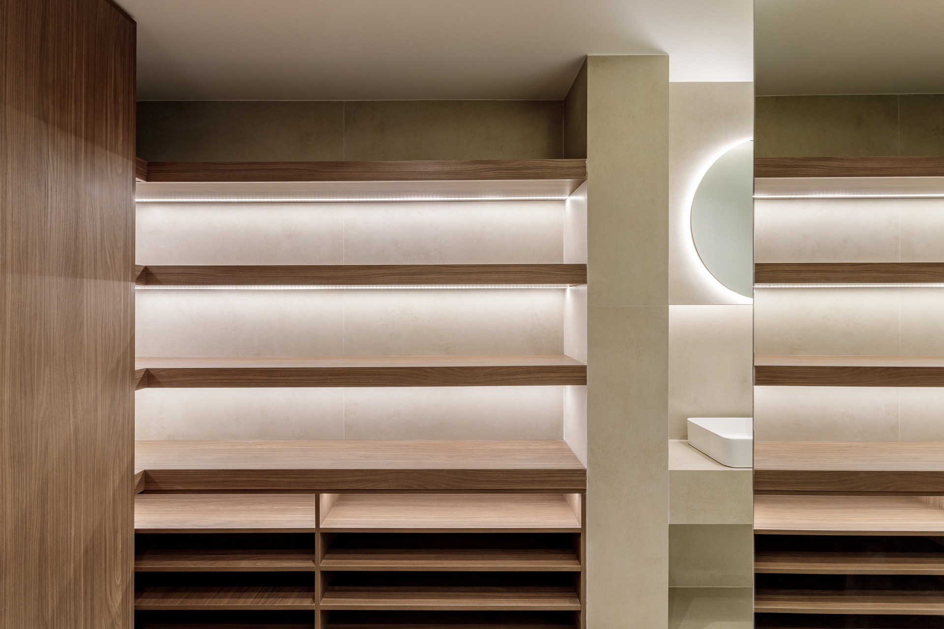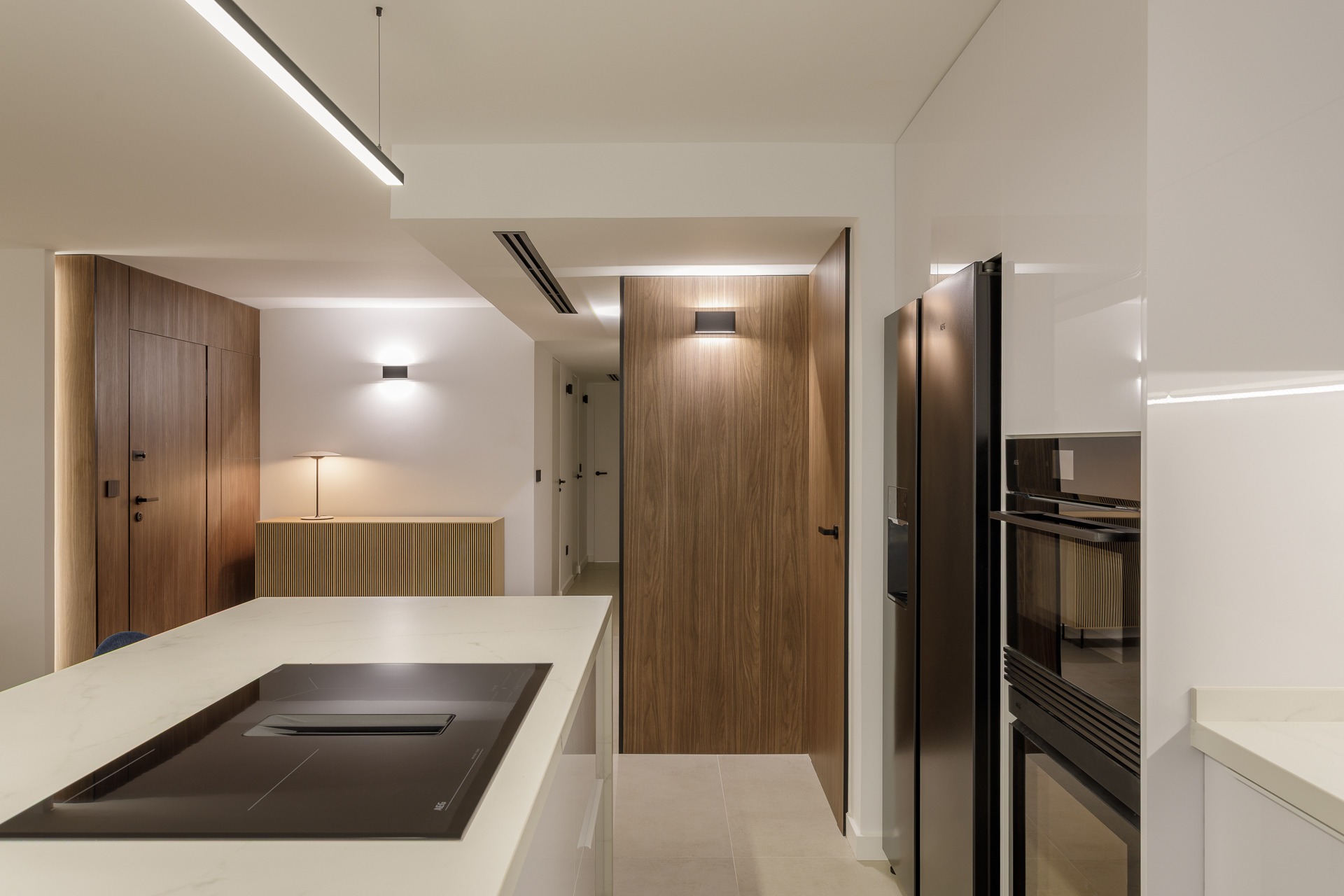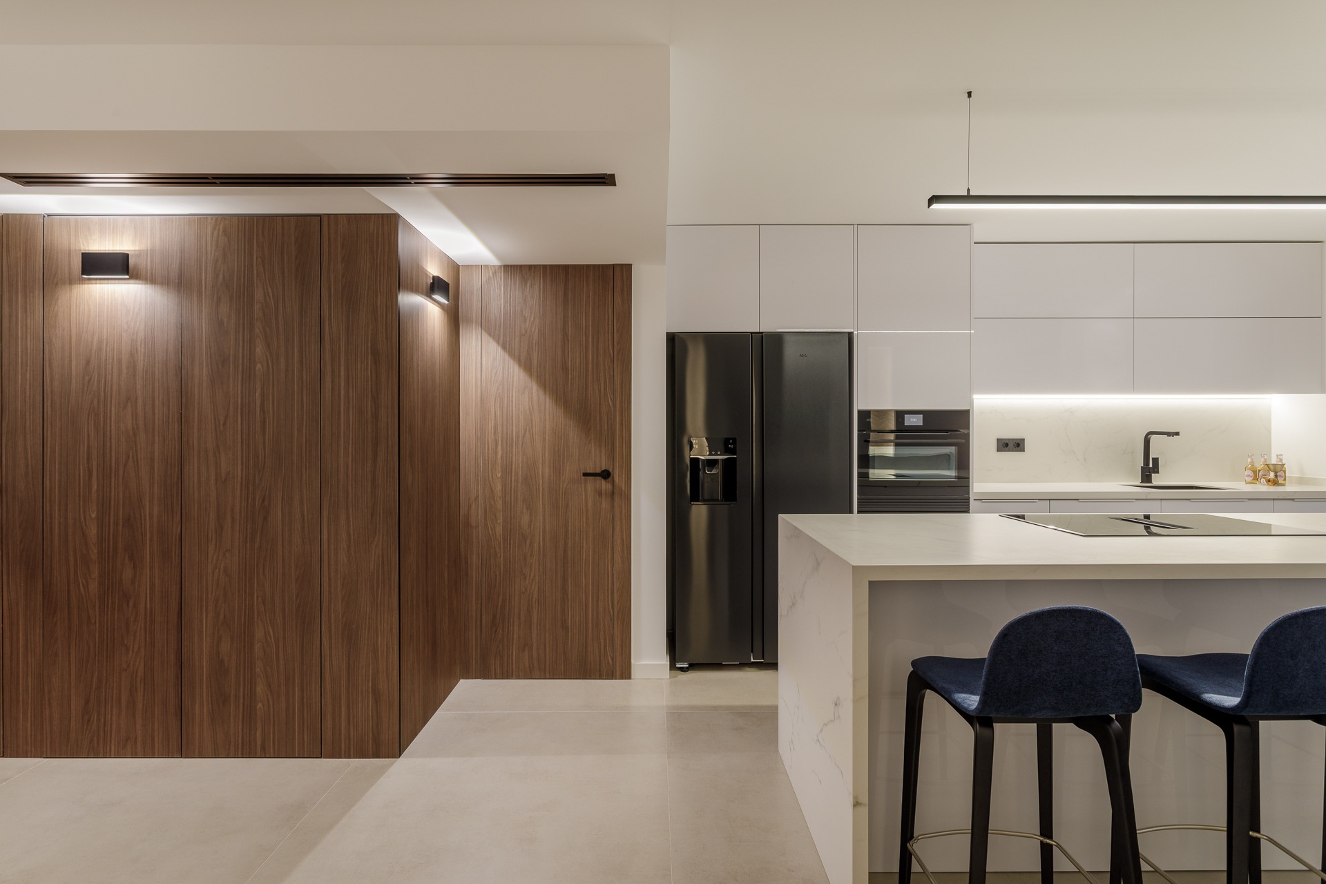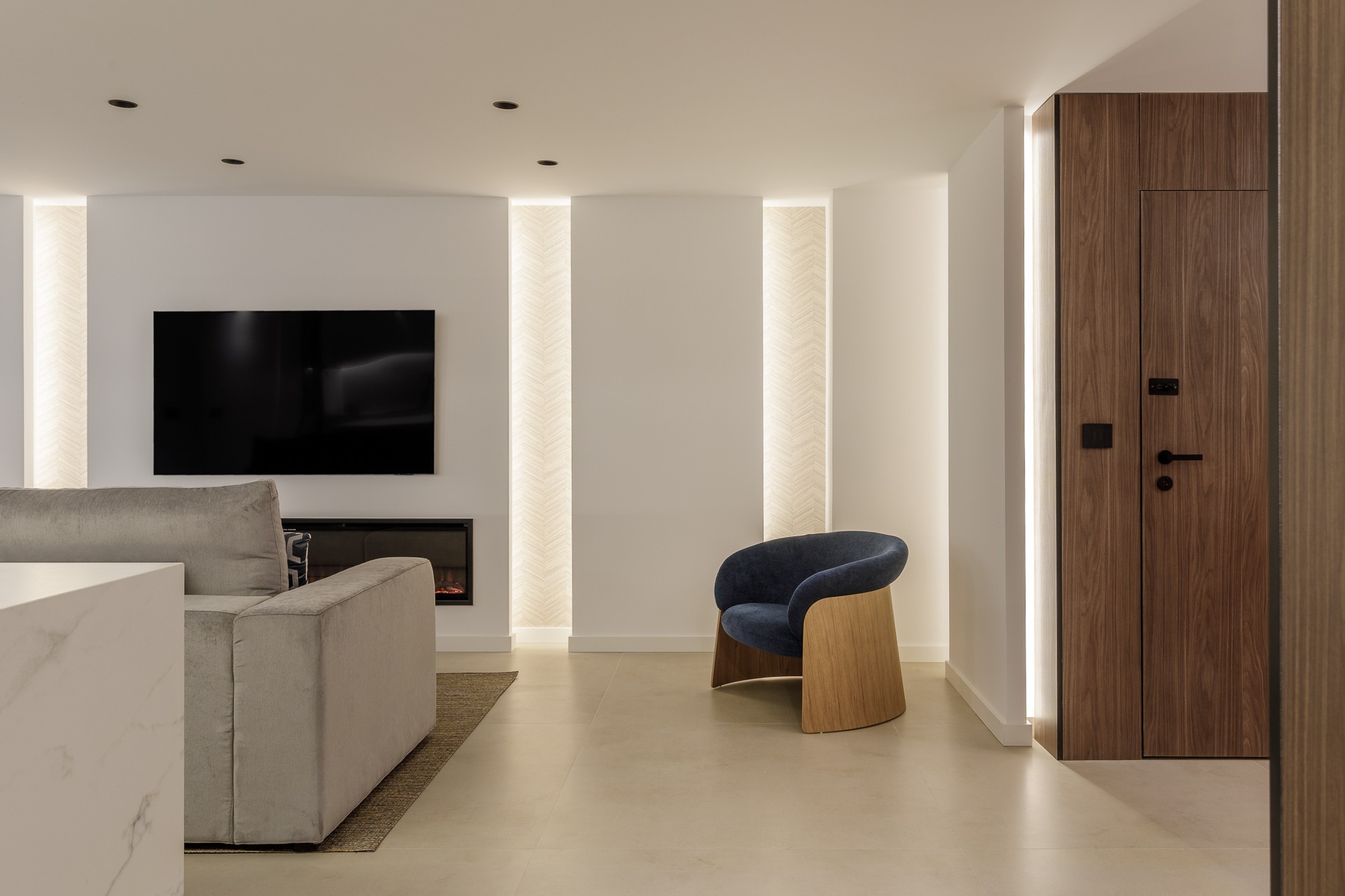 El verdadero protagonista es el estudio lumínico. Se ha proyectado una iluminación indirecta integrada mediante foseados verticales y horizontales en paramentos y techos técnicos que favorece la conexión de espacios.