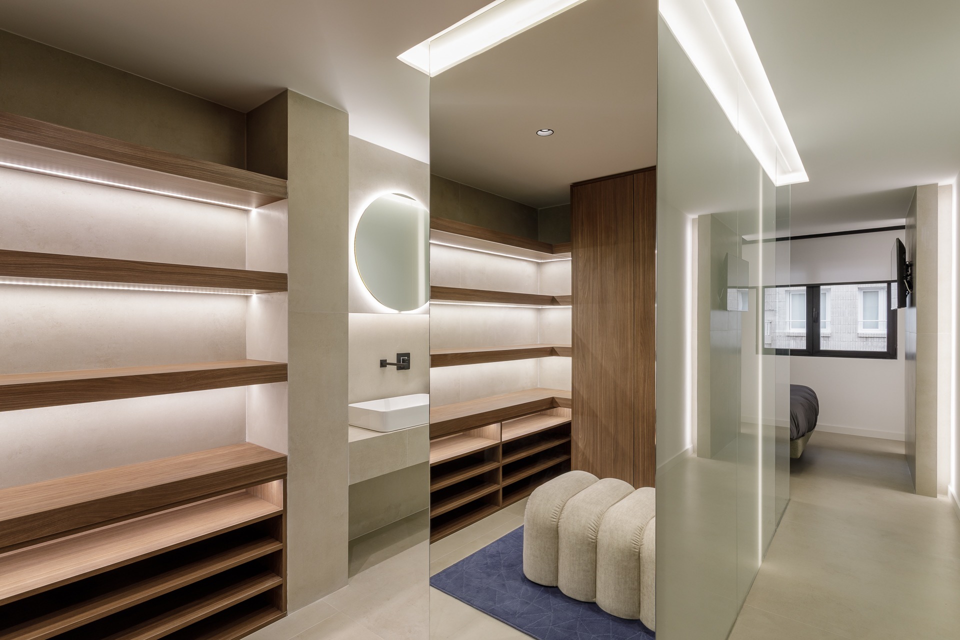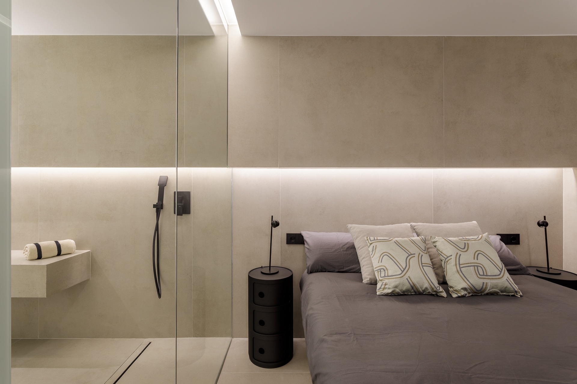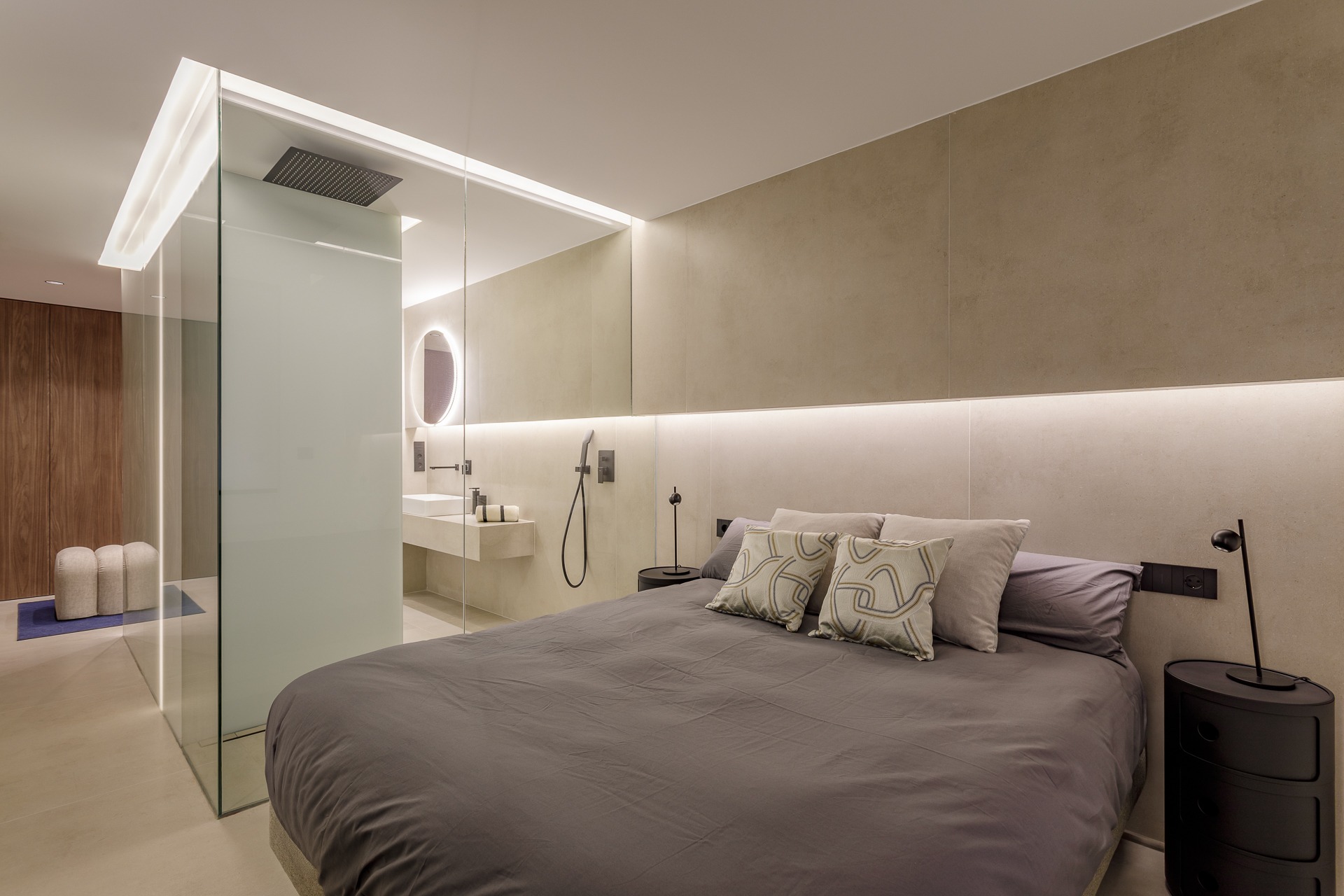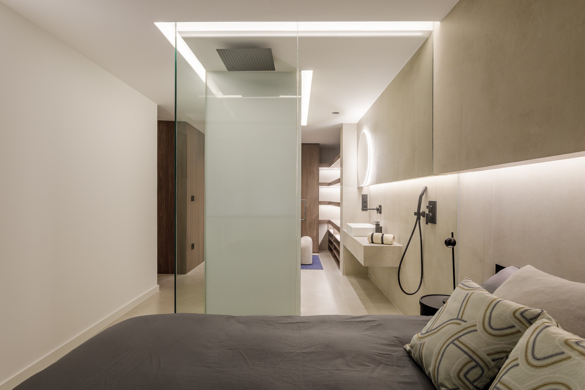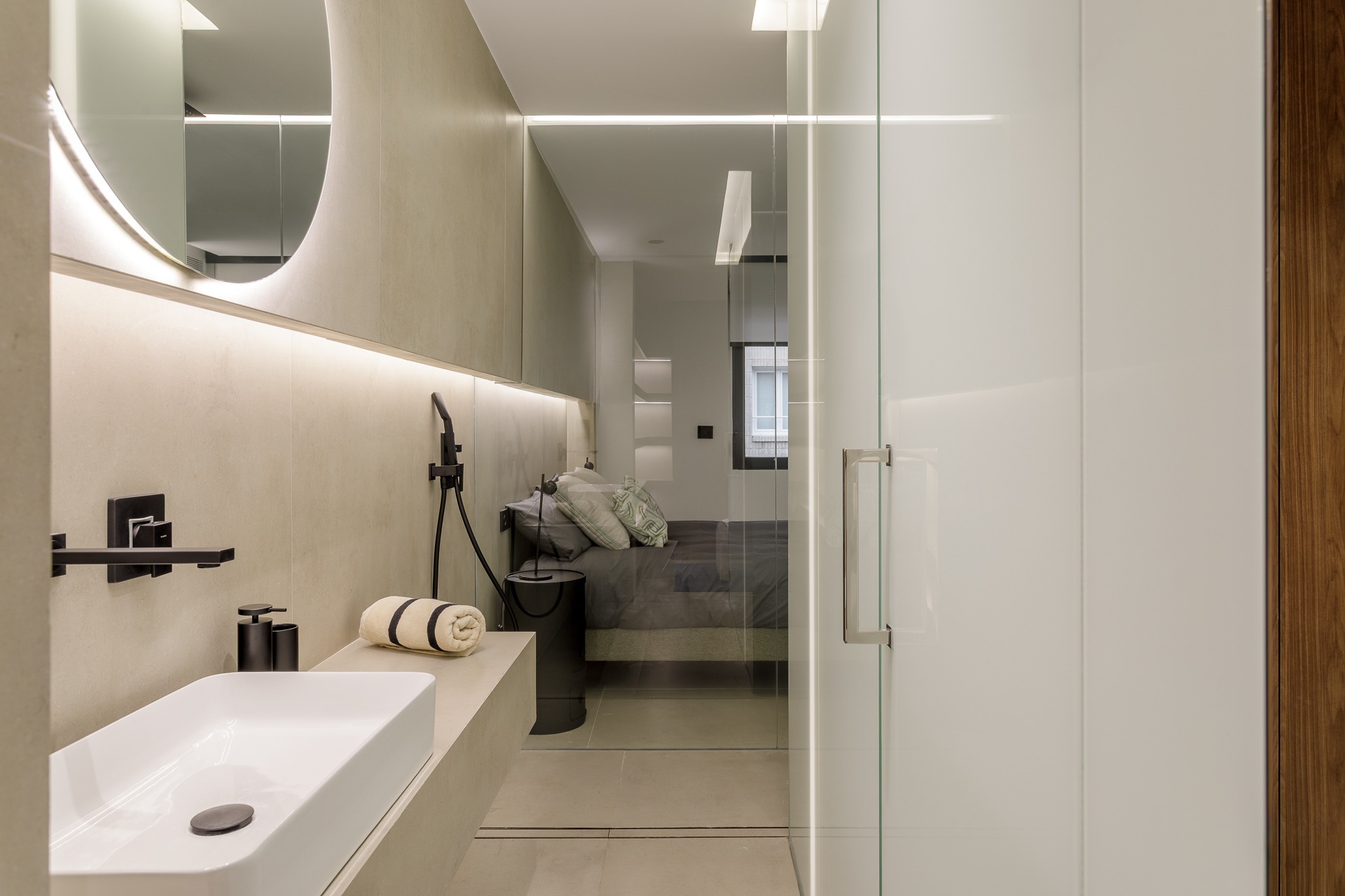 El diseño rompe con la compartimentación tradicional al conectar la zona de descanso y vestidor con la zona húmeda (baño) a través de un cerramiento de vidrio de gran formato. Esta solución arquitectónica no solo aporta una estética contemporánea y hotelera, sino que además, permite que la luz natural bañe todo el espacio, eliminando la sensación de confinamiento en el baño.