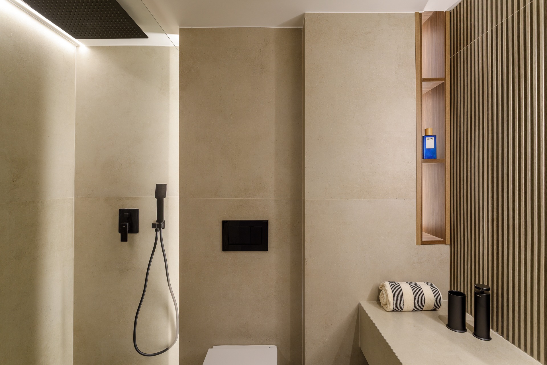 En la zona de ducha, la pendiente se resuelve de forma integrada en el propio plano del suelo con sistemas de evacuación lineal ocultos, manteniendo la estética minimalista.